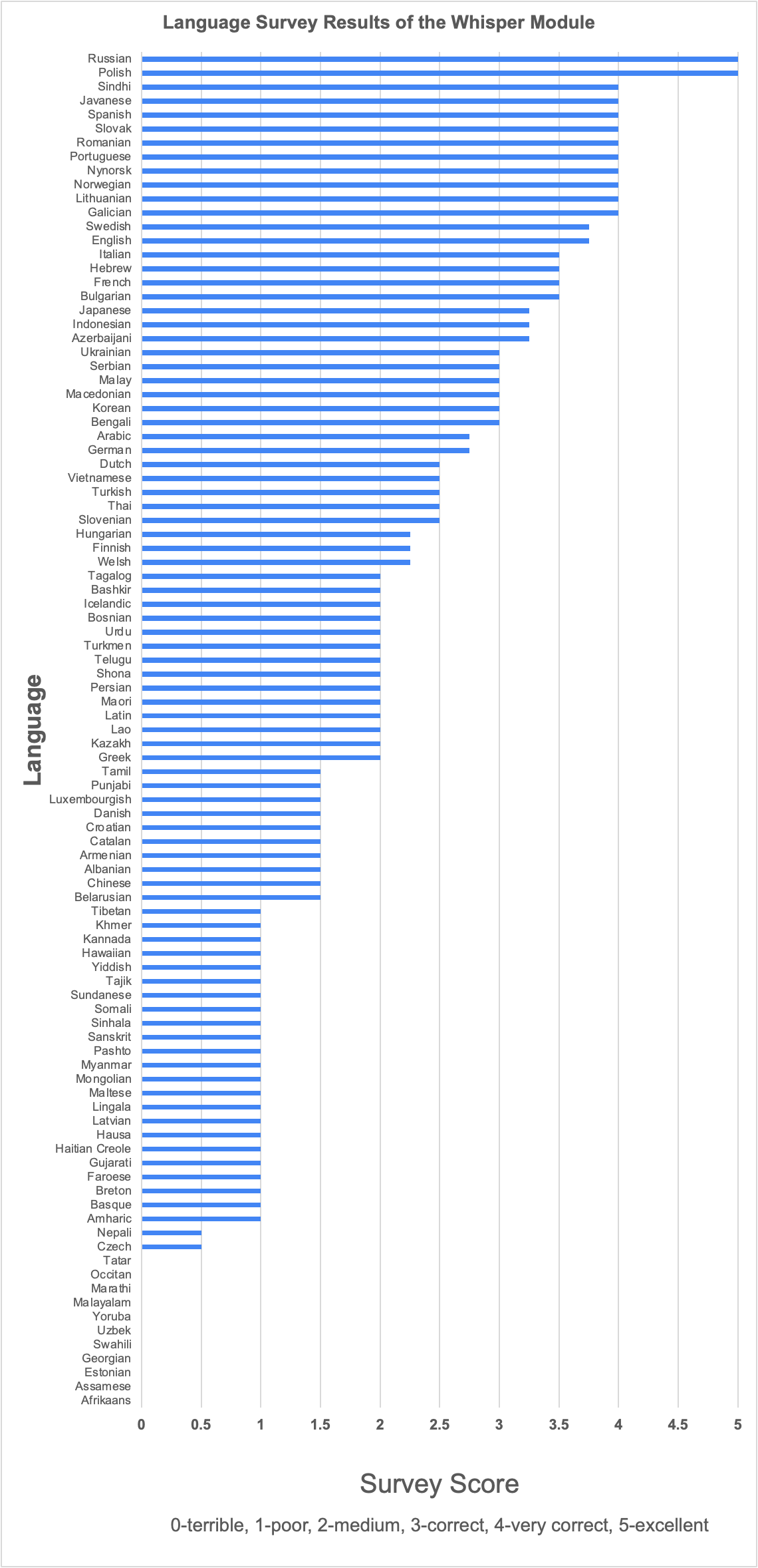 Below, you can see a graph of survey results of 98 languages using the whisper module. The average scores from Table 1 were used for this graph.