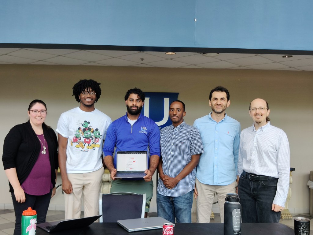 From left to right: Dr. Amy Cook (capstone course instructor), Elijah Lewis (capstone course student), Kamaal Orgard (capstone course student), Jaylon Taylor (capstone course student), Dr. Fatih Sen (owner of ToText, comp sci instructor and capstone project supervisor), Dr. Brandon Booth (capstone course instructor).