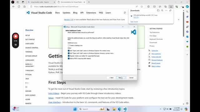 - Click “Next” and ensure you check the options to add Visual Studio Code to your PATH and create a desktop icon.